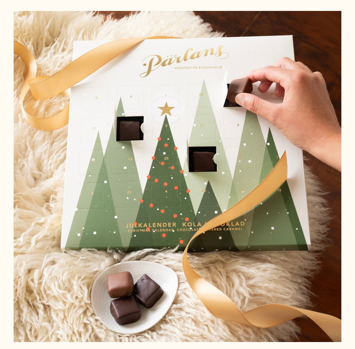 Adventskalender med prima chokladdoppade kolor från Pärlans Konfektyr i Stockholm, 24 olika smaker